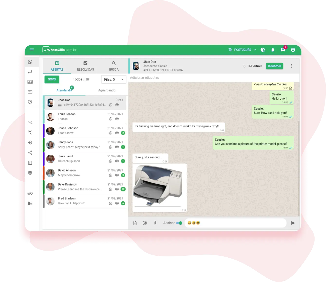 A interface simples faz com que sua equipe sinta-se à vontade para realizar os atendimentos com seus clientes. O WhatsZilla promove solução de problemas, ótima experiência dos usuários, agregando valor ao seu negócio!
